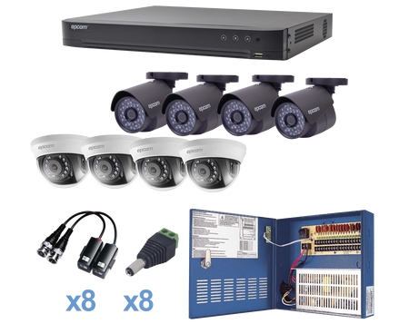 Sistema TURBO HD720p, Incluye DVR 8Ch / 4 Cámaras Bullet (exterior 3.6 mm) / 4 Cámaras Domo (interior 2.8 mm) / Transceptores / Conectores / Fuente de poder profesional, Hasta 15 Vcd para Larga Distancias