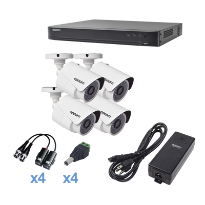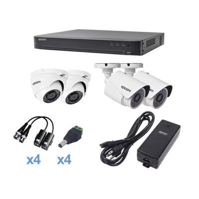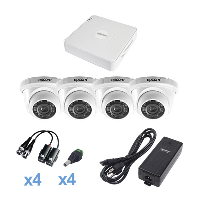 Sistema TURBOHD 1080p / DVR 4 Canales / 4 Cámaras Eyeball (exterior 2.8 mm) / Transceptores / Conectores / Fuente de Poder Profesional