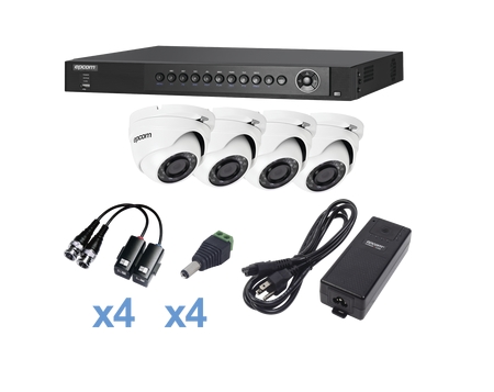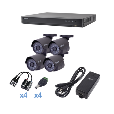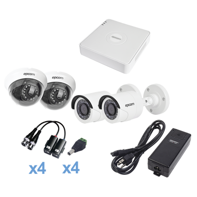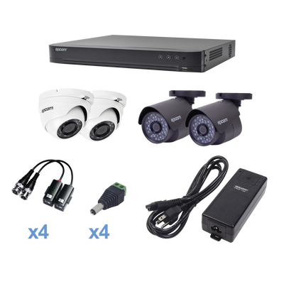 Sistema TURBOHD 720p / DVR 4 Canales / 4 Cámaras Eyeball (interior 2.8 mm) / Transceptores / Conectores / Fuente de Poder Profesional