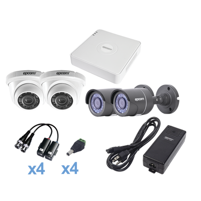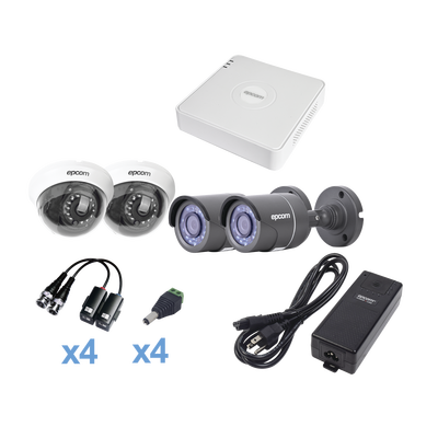 Sistema TURBOHD 720p / DVR 4 Canales / 2 Cámaras Bala (exterior 3.6 mm) / 2 Cámaras Domo (interior 2.8 mm) / Transceptores / Conectores / Fuente de Poder Profesional