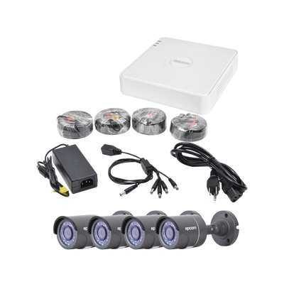 Sistema Completo de 4 Cámaras Bala TURBOHD 720p / DVR 4 Canales / Hik-Connect / Fuente de poder / 4 juegos de cable de 18mts
