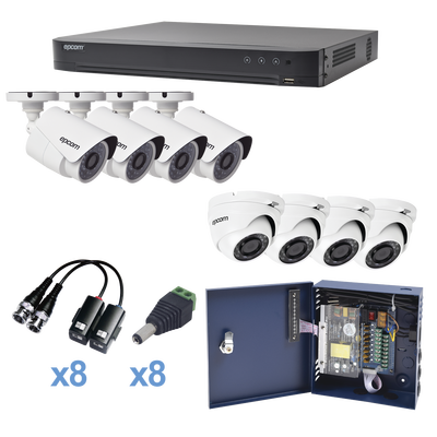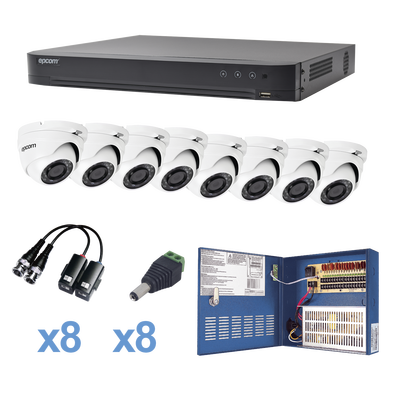 Sistema TURBOHD 1080p / DVR 8 Canales / 8 Cámaras Eyeball (exterior 2.8 mm) / Transceptores / Conectores / Fuente de Poder Profesional hasta 15 Vcd para Larga Distancia