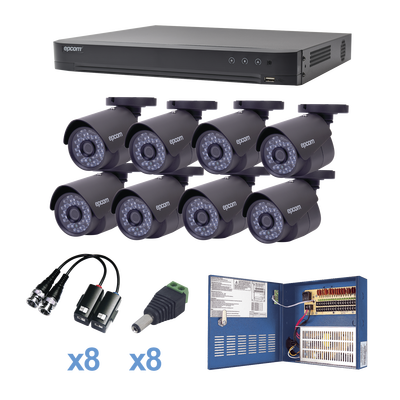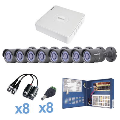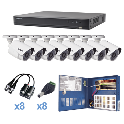 Sistema TURBOHD 1080p / DVR 8 Canales / 8 Cámaras Bala (exterior 2.8 mm) / Transceptores / Conectores / Fuente de Poder Profesional hasta 15 Vcd para Larga Distancia