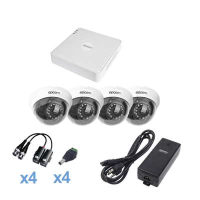Sistema TURBOHD 720p / DVR 4 Canales / 4 cámaras Domo (interior 2.8 mm) / Transceptores / Conectores / Fuente de Poder Profesional
