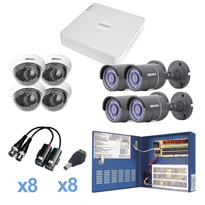 Sistema TURBOHD 1080p / DVR 8 Canales / 4 Cámaras Bala (exterior 2.8 mm) / 4 Cámaras Domos (interior 2.8 mm) / Transceptores / Conectores / Fuente de Poder Profesional hasta 15 Vcd para Larga Distancia