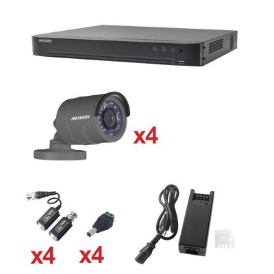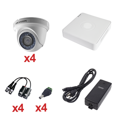 Sistema HIKVISION TURBOHD 720p / DVR 4 Canales / 4 Cámaras Eyeball (exterior 2.8 mm) / Transceptores / Conectores / Fuente de Poder Profesional