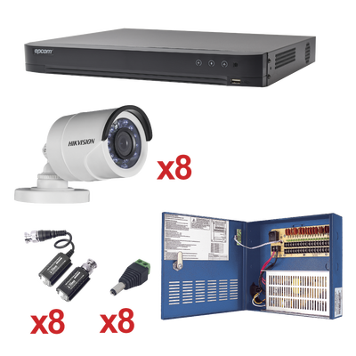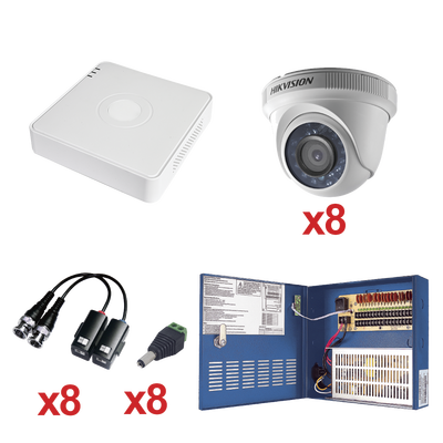 Sistema HIKVISION TURBOHD 720p / Incluye DVR 8 Canales / 8 Cámaras Eyeball 2.8 mm / Transceptores / Conectores / Fuente de Poder Profesional