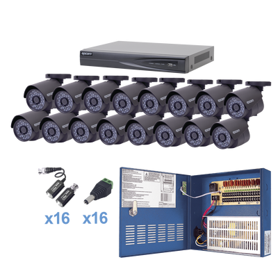 Sistema TURBOHD 1080p / DVR 16 Canales / 16 Cámaras Bala (exterior 2.8 mm) / Transceptores / Conectores / Fuente de Poder Profesional