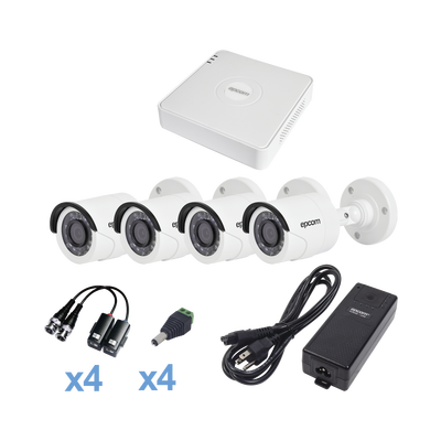 Sistema TURBOHD 1080p / DVR 4 Canales / 4 Cámaras Bala (exterior 2.8 mm) / Transceptores / Conectores / Fuente de Poder Profesional